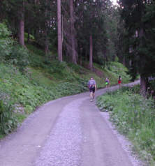 ihm vorbeilaufe, sagt er zu mir: "Guck dich mal um!" Und siehe da: Ich erblicke eine der schönsten Bergkulisssen des ganzen Laufes. Es tut sich ein herrlicher Blick auf den verschneiten Piz Ela auf. (Leider kann ich kein Foto präsentieren, weil das Foto nichts wurde) Er sagt, er läuft nun schon zum 10. Mal mit und jedes Mal macht er an dieser Stelle eine Pause. Nach etwa 47 Kilometern erreichen wir den winzigen Bergort Chants. Gemütlich laufe und gehe ich nun auf einen Fahrweg, der durch einen hübschen Bergwald führt bergan. Schon bald erreichen wir eine Verpflegungsstelle. Gleich dahinter droht ein extrem steiler Bergweg. Ich stärke mich noch einmal in aller Ruhe und frage wie hoch das ganze