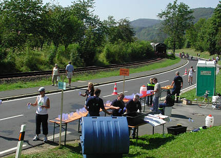 Verpflegungspunkt. Hinten kommt die Museumsbahn entgegen gefahren.