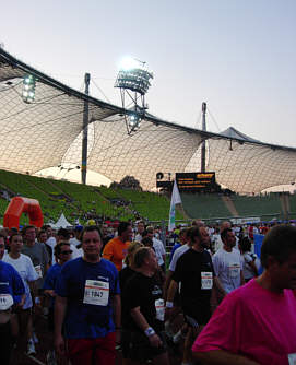 Wir drehen hinter dem Ziel noch fast eine ganze Ehrenrunde durchs Stadion, um die