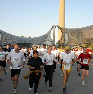 Der alles überragende Olympiaturm, wo wir Läuferschar so winzig wirken. |