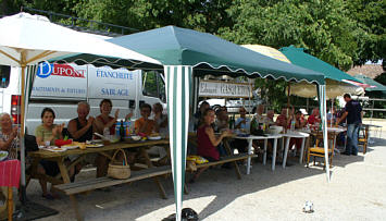 Bei km 32 an der „Freundschaftsmauer“ kam dann eine Hinweistafel auf das ab km 38 zu erwartende „Menü“ für die letzten Kilometer bis ins Ziel. Man konnte sich noch auf Schinken, Paté, Steak, Käse und Eis freuen. Dies gab sicherlich so manchem einen guten Schub, um den „Mann mit dem Hammer“ ein Schnippchen zu schlagen. Bei mir war die Freude allerdings nicht so groß, da die in der Ausschreibung versprochenen Austern nicht avisiert wurden – kommen die trotzdem noch? Die letzten 5km verliefen parallel, und teilweise im Schatten, zur Gironde. Obwohl ich sehr gerne an Flüssen entlang laufe, nach 37km voller Abwechslung wirkten diese dann doch etwas zäh. Auch war ich von den angekündigten Ständen mit den Spezialitäten (keine Austern) nicht so angetan und habe nur schnell etwas gegriffen und bin weitergelaufen. Im Nachhinein habe ich überlegt, warum ich hier nicht etwas stehen geblieben bin und die verschiedenen Sachen etwas mehr gekostet habe. Mein Schluss war, dass durch die Hitze, welche ich eigentlich gut vertrage, aber auch durch den Trott von 37km in durchschnittlich knapp 5.30 min/km man eigentlich mehr dem Ziel entgegen strebt, um noch eine akzeptable Zeit (Sub 4 Std sollten es, jedenfalls für mich, auch bei einem Genußlauf sein) zu erzielen. Außerdem passt so ein Gefutter für mich dann doch nicht so recht zu einem Marathon. Dies mag für die Läufer, welche ihre Kraftreserven bereits mehr erschöpft haben bzw. die 6,5 Std. für den Zielschluss ausnutzen, und vielleicht auch dem Wein schon mehr zugesprochen haben, eine willkommene Pause sein.