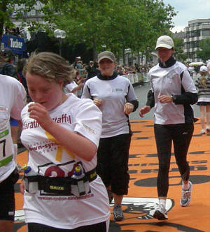 Down-Syndrom-Marathon-Staffel im Ziel ankommt.