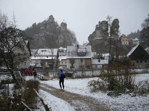 Kurz nach neun Uhr starteten wir. Zuerst joggten wir durch das Püttlachtal nach Tüchersfeld, das als Felsendorf über die Region hinaus bekannt ist.