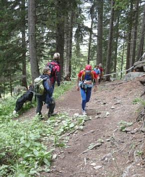 einen Fahrweg kreuzen. Dahinter wird es so steil, dass auch in den Schritt