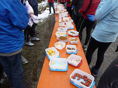 Die Verpflegung beim Eisweinlauf kann man nicht oft genug loben. Da merkt man, dass dies hier von erfahrenen Ultraläufern organisiert wird. Außerdem liegen unsere Rucksäcke mit Wechselklamotten etc. an allen Verpflegungsstellen nach Nummern sortiert übersichtlich auf einer großen Plastikplane.