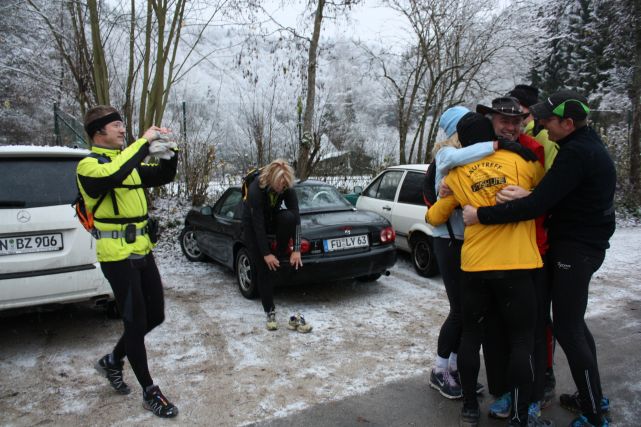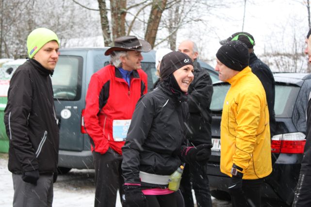 Da es recht kalt ist, wärmen sich die Läufer schon am Start. |