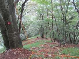 Kar zum Cez Suho hoch - Weitere Bilder Am Cez Suho in 1790 Meter Höhe fasse ich Verpflegung und lass mich fotografieren. Dahinter geht es einen schmalen Bergpfad bei einem bissig kalten Wind erst einmal steil bergab. Auf gut 2 Kilometern Laufstrecke verlieren wir an die 800 Höhenmeter. So wird es bald wieder milder und ich lass den Bergnebel über mir zurück. Passend zur nun immer lieblicher werdenden Landschaft, mit schon fast mediterranem Charakter, kommt sogar allmählich die Sonne etwas durch. Bis Kilometer 16 geht es fast nur bergab. Dahinter folgt ein Gegenanstieg. Ich weiß, dass so was hier kommen soll, bin aber überrascht wie es wieder in die Höhe geht. Es zieht sich in die Länge, zumal ja der tiefste Punkt schon bald folgen soll. Ein Blick auf den barometrischen Höhenmesser zeigt mir, dass wir mittlerweile schon an die 1600 - 1700 Höhenmeter bergauf gelaufen sind, also kann das mit den angegebenen 2500 Höhenmetern niemals stimmen , da der noch vor uns liegende tiefste Punkt nur in 361 m Höhe liegt und die nächste Passhöhe auf dem Porezen dann in 1590 m Höhe. Nach einer steilen Bergabpassage erreiche ich schließlich