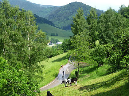 Dann geht es wieder über sonnige Wiesen, zwischendurch kurz auf Asphalt an Kühen