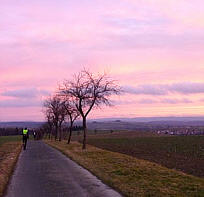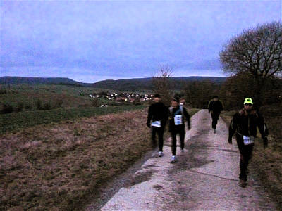 Um 6 Uhr starten wir dann hinaus in die Dunkelheit. So ganz ohne Schnee und Eis wirkt heute unser Lauf durch den Göttinger Wald fast wie ein nächtlicher Lauftreff. An einigen Stellen stecken brennende Fackeln neben dem Weg. Anfangs laufen wir leicht aufwärts, dann bergab. In einer Kehre sehe ich Dutzende von Stirnlampen unter und über mir.