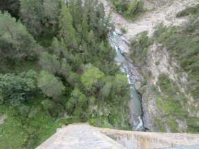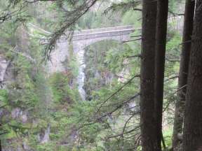 Endlich lassen wir kurz dahinter das lange Asphaltband hinter uns. Nun laufen wir auf einem Wanderweg durch einen urigen Bergwald in Richtung Monstein. Dabei öffnen sich immer wieder schöne Ausblicke, die mich zum verweilen einladen möchten. Aber das Diktat der Zielschlusszeit treibt mich weiter. MonsteinMonstein kündigt sich mit der "Neuen Dorfkirche" an, wovon ich einen wunderschönen Blick in das tief unter uns liegende Landwassertal habe. Hinter der Kirche macht der Weg einen scharfen Knick und schon läuft man durchs kleine Dorf, dessen Alte Kirche von 1668 seit Ende des 19. Jahrhundert nur noch für Gemeindeversammlungen genutzt wird. Kurz dahinter fasse ich Verpflegung und schieße gen Tal. Weil es nun auf einem asphaltierten und später geschotterten Fahrweg stets bergab geht, komme ich schnell in Fahrt. LandwasserschluchtAls erster Höhepunkt der langen Laufstrecke folgt nun die Landwasserschlucht, wo sich die Fluten der Landwasser tief und schroff in die Felsen eingeschnitten haben. Es öffnen sich nun immer neue dramatische Ausblicke. Wir durchqueren auch mehrere Tunnel, in denen es richtig dunkel ist. Oft weiß ich gar nicht weiß wo ich da gerade hintrete, weil man in der Dunkelheit den Untergrund nicht erkennen kann. Wiesen und FilisurHinter dem Wiesener Bahnhof überquere ich den fast 90 Meter hohen