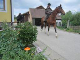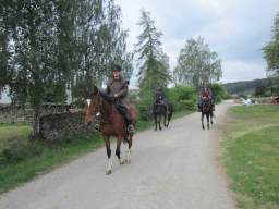 16.05.2011 - 30 KM von Kühnhardt nach LimbachAm Vorabend des großen Laufs und Ritts wandern wir noch abends gemeinsam von Kühnhardt nach Mosbach zum Abendessen. Unterwegs entdecken wir auf einer Wiese einen Storch und im Ort dann auch noch das Storchennest dazu. Am folgenden Tag starten wir die erste Etappe die uns von Kühnhardt meist in Richtung Westen bis nach Limbach führt. Mit etwa 30 Kilometern ist es die kürzeste Etappe, also ideal zum Eingewöhnen. Die umliegende Gegend ist ländlich geprägt, dünn besiedelt und hügelig. Die Wege sind abwechslungsreich. Fast zugewachsene Pfade wechseln sich mit Fahrwegen und auch mal kaum befahrene Landstraßen ab. Mittags machen wir unterwegs im Grünen ein Picknick. Bei einer Viehtränke, können wir auch einmal unterwegs die Pferde tränken. Als wir schließlich in Limbach unseren ersten Übernachtungsplatz erreichen, werden wir dort freundlich aufgenommen und die Wirtin serviert uns ein leckeres Abendessen. Bilder für vergrößerte Ansicht einfach anklicken! |