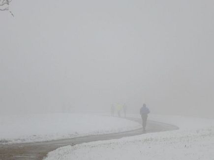 Nun umhüllt uns kalter Nebel. Nur ganz selten sehe ich einen Läufer mit kurzen
