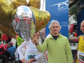 Zugläufer. Traditionell treffen wir Zugläufer uns vor dem Gasthof Sonne und wie alle Jahre müssen wir auch den gordischen Knoten des Seils entwinden, womit unsere Luftballons festgemacht. Dabei verlieren die meisten von uns dann später doch noch ihre Ballons. Aber wir sind ja auch durch unsere roten Laufshirts mit aufgedruckter Zielzeit erkennbar.