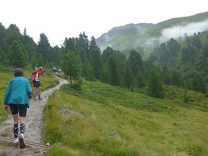 Regenschauer die Läufer in Bergün. Dann geht es etwas abseits der Altstadt auf