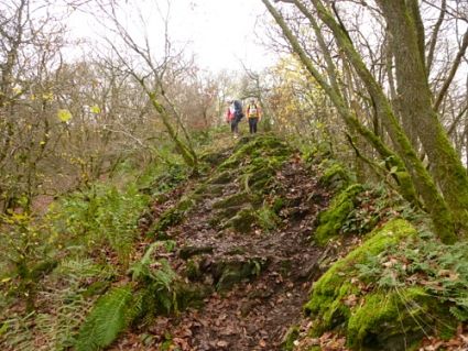 Nach einem längeren Aufstieg laufen wir einige Zeit auf einem immer nur wenige Meter auf und ab führenden Weg bzw. Trail entlang des Tales, wobei wir durch die Bäume hindurch oft zur Sauer hinab und rüber zu den Hügeln auf der anderen Seite blicken können. Da diese Gegend recht dünn besiedelt ist gefällt mir die Aussicht.