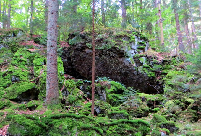Hier überqueren wir in einem urigen Wald einen Bach