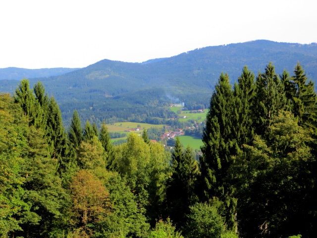 Hier erreichen wir den schönen Aussichtspunkt bei Frath. Auf der anderen Seite ist gut der Hauptkamm des Bayerischen Waldes erkennbar, dessen höchsten Berge die 1400 Metergrenze überschreiten. Der Große Arber ist ein Stück weiter rechts, also auf dem Bild nicht erkennbar. Den Großen Arber bestieg ich in einer zweiten Tour von Bodenmais aus.