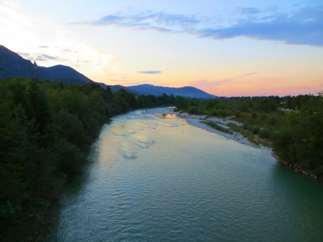 Ich laufe nun noch ein weiteres Stück die Isar entlang. Sie sieht jetzt zusammen mit den Bergen im Abendlicht besonders schön aus. Ja, gerade die Morgen- und Abendstimmungen sind immer besonders schön.