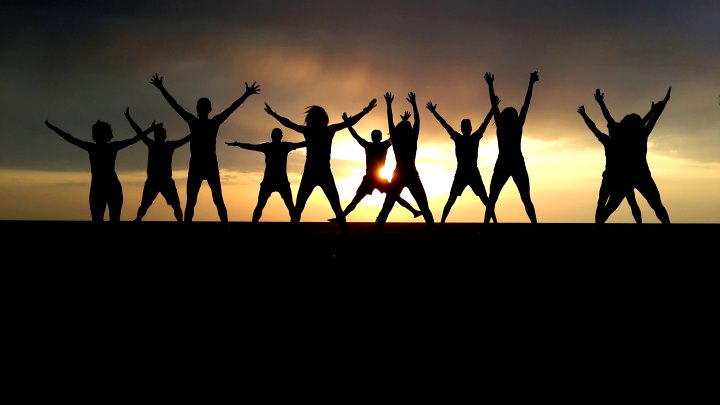 Einzelne, die hochsprangen, kleinere und größere Gruppen, die sich schwarz gegen