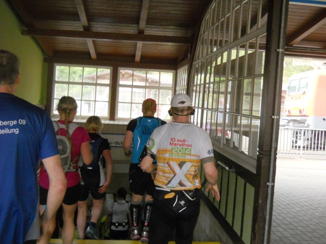 Der eigentliche Marathon war dann am Sonntag. Nach ca. 40 Minuten Fahrt mit der S-Bahn von Dresden nach Königstein (in der glaube ich nur LäuferInnen sowie Angehörige derselben waren) ging es über einen kurzen Fußmarsch zum Start / Zielbereich.  Eine Gepäckabgabe gab es natürlich und auch mit heißem Tee wurden die Läufer vor dem Start noch versorgt.