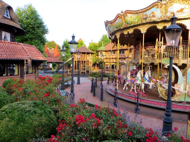 Ich gucke durch den Zaun in den Heidepark Soltau hinein. Weil schon Abend ist, ist er geschlossen.