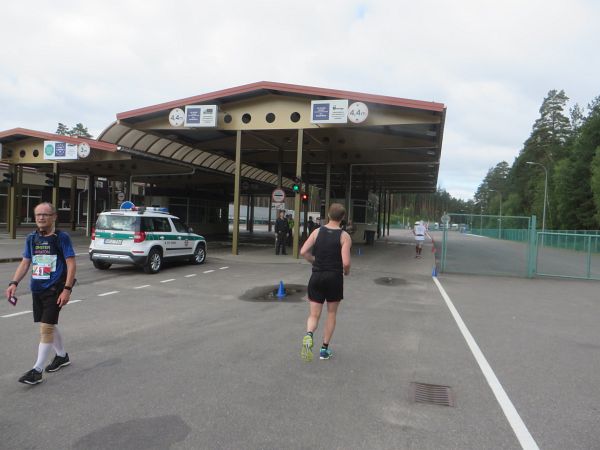 Die Kleiderbeutelabgabe klappte reibungslos, es gab auch kein langes Anstehen bei den Toiletten. Nach ein paar Reden in Litauisch und Russisch ging es pünktlich um 8 Uhr für uns 150 Marathonis los. Es ging die Fußgängerzone hoch zur Kirche und vorbei an zwei Seen auf der Landstraße leicht bergan hinaus und dann rechts auf die A4, der gut ausgebauten Verkehrsachse nach Belarus. Bis zur Grenze war die Strecke für den Verkehr für uns aufwändig gesperrt worden. Die ersten 11 km waren geschafft.