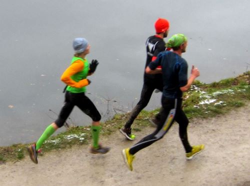 Eleganter Laufstil von drei Spitzenläufern beim Nikolauslauf 2013 in Forchheim. Weil sie auf Tempo bei einem Laufwettbewerb mitliefen, sind ihre Schrittlängen entsprechend lang. Der Normalläufer sollte im Laufalltag kürzere Schrittlängen wählen und auch die Arme weniger abwinkeln als diese Wettkampfläufer! Auch die Wahl des Laufmaterials hat Einfluss auf die Beschwerdefreiheit. Am wichtigsten ist die Wahl des richtigen Laufschuhs. In den meisten kompetenten Laufsportgeschäften kann man eine Laufanalyse in Anspruch nehmen. Diese Analyse hilft zum einen den perfekten Schuh für den eigenen Lauf zu finden, andererseits hilft die Analyse dabei, Fehler im Laufstil aufzudecken. Eine solche Analyse ist daher nicht nur für ambitionierte Läufer, sondern auch für Anfänger lohnenswert. Keine Angst vor dem LaufenAuch wenn es ein paar Risikofaktoren gibt, prinzipiell ist jeder gesunde Mensch dazu in der Lage, mit einfachsten Mitteln Laufsport zu betreiben. Teuer ist der Sport auch nicht, auf wertige Laufschuhe sollte allerdings niemand verzichten. |