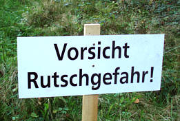 eines steilen Single-Trails steht das Warnschild ?Vorsicht Rutschgefahr! |