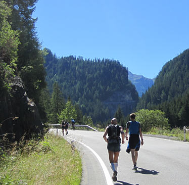 Die Albulastraße führt uns erst sanft und dann später etwas steiler in Richtung Albulaschlucht und Bergün hoch. Hier spüren wir erstmals die Sonne, die gerade den Asphalt schnell aufheizt. Am steileren Abschnitt kann ich erstmals mit ein paar Spätstartern mithalten, die hoch wandern, während ich hier wie ein stolzer Gockel in kurzen Laufschritten zwar langsam, aber immerhin jogge.