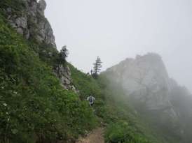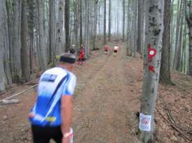 Gewitternacht danach erfolgen. Das nennt man Wetterglück! Schon bald fällt der Startschuss und schickt uns auf die anspruchsvolle Strecke. Die flache Einrollphase währt etwa 100 Meter, danach geht es bereits auf Waldwegen steil bergauf. Fast alle sind hier gertenschlank und total fit. So lassen sie mich und ein paar andere ebenfalls, etwas beleibtere und Genuss liebende Läufer sehr schnell links liegen. Mich bekümmert das wenig, weil die Strecke landschaftlich schön und die Wege abwechslungsreich und anspruchsvoll sind. Da brauch ich kaum Mitbewerber um mich. Leider tauchen wir bald in den Bergnebel mit gefühlter 120%iger Lauffeuchtigkeit ab, so dass wir leider kaum schönen Ausblicke genießen können. Der Nebel schärft aber den Blick für das Detail und nahe liegende. Ich entdecke Orchideen und andere Blumen, bizarr geformte Bäume und Steinpyramiden und vor Abgründen kann ich raten, ob es da nur 10 Meter oder vielleicht doch sogar 500 Meter bergab geht. An den Verpflegungspunkten empfangen mich liebe Menschen, zwar alle in einer fremden Sprache, aber mit soviel Herzlichkeit, die unter die Haut geht. Langsam geht es zum Cez Suho hoch, das letzte Stück auf einem Kar zwischen zwei Felsenwänden gestaltet sich als steil und dramatisch aussehend, in mancherlei Hinsicht erinnert mich dieses Stelle etwas an den Anstieg zum Rindalphorn hoch beim Immenstädter Gebirgsmarathon. Was technischen Anspruch und Höhenmeter betrifft, übertrifft dieser Fastmarathon aber sogar den Immenstädter Gebirgsmarathon.