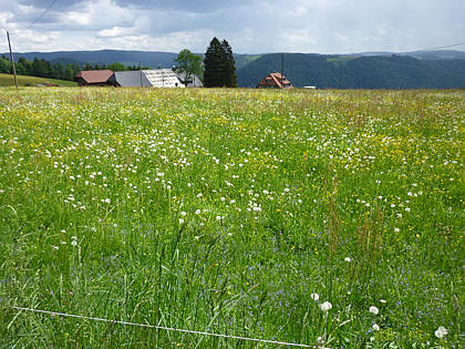 auf Asphaltwegen. Üppige Blumenwiesen und weite Aussicht, u.a. auf den in der