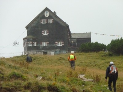 Schließlich erreichen wir die Falkenhütte (1848 m). Eine originelle Dekoration der Hütte ist das scheinbar auf einem Seil hinauf fahrende Rad.