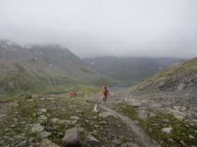 dazukommt! Die Landschaft wird nun immer hochalpiner. Die Baumgrenze liegt nun schon unter mir. Wären da nicht die Gletscher des heute von Wolken verdeckten Piz Kesch, könnte ich mich ins Schottische Hochland versetzt fühlen, zumal jetzt auch noch ein unangenehm kalter Wind aufkommt. Keschhütte und SertigpassDie ärztliche Sichtkontrolle vor der Keschhütte