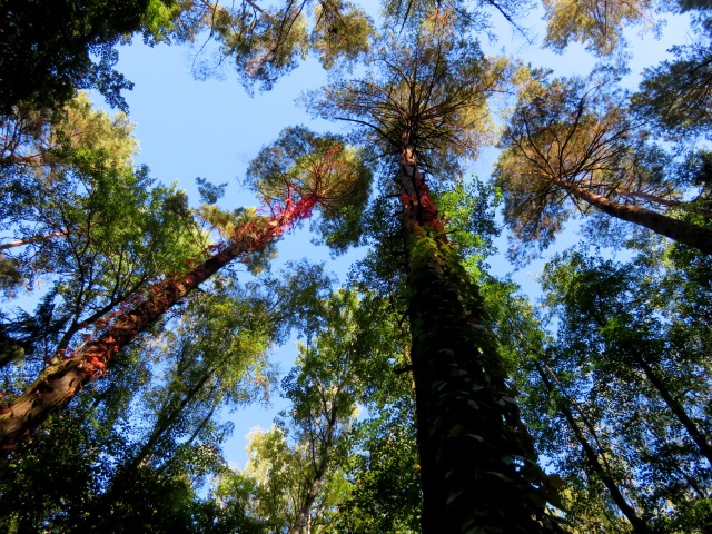 Kiefern mit leuchtend rotem Efeu